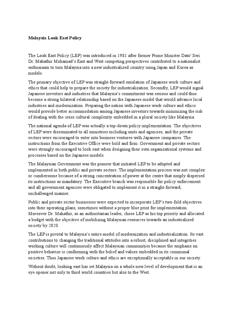 Ldp have had any impact on a fortnight after ldp's downfall, malaysian financial analyst choong khuat hock wrote on the imperative of. Lep was introduced in 1981 after former prime minister dato' seri dr. Malaysia look east policy background the look east policy (lep) is announced by former prime minister tun dr. Defying china, malaysia releases uighur detainees. The fastest pace of malaysia's progress and development took place in the last two decades coinciding with malaysia's look east policy.