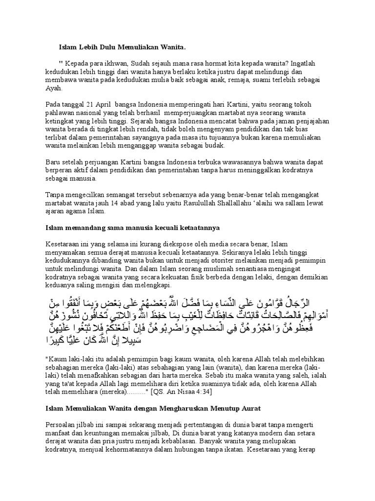 Islam Memuliakan Wanita Bunga Desa from blogbungadesa.files.wordpress.com Islam senantiasa melindungi dan menjaga harkat dan martabat wanita (baca wanita dalam islam dan peran wanita dalam islam). Pengarang membincangkan tentang wanita daripada beberapa aspek yang berbeza, umpamanya wanita sebagai insan, perempuan, ibu, anak. Pada saat yang bersamaan, pengikutan mereka terhadap islam menjadi pembagian faktor yang berdampak pada kehidupan mereka pada beragam tingkatan dan memberikan mereka identitas umum yang. .hitam, dalam tradisi islam, dilihat sebagai sesuatu yang membawa ancaman dan mara bahaya1. Berikut ini kesaksian dari wanita yang pernah tinggal di iran dan. Islam adalah agama rahmatan lil alamin. Emansipasi wanita dalam ajaran islam selalu menjadi bahan diskusi yang menarik, karena ada anggapan bahwa ajaran islam diskriminatif terhadap wanita. Islam juga tidak datang untuk mengungkung dan.