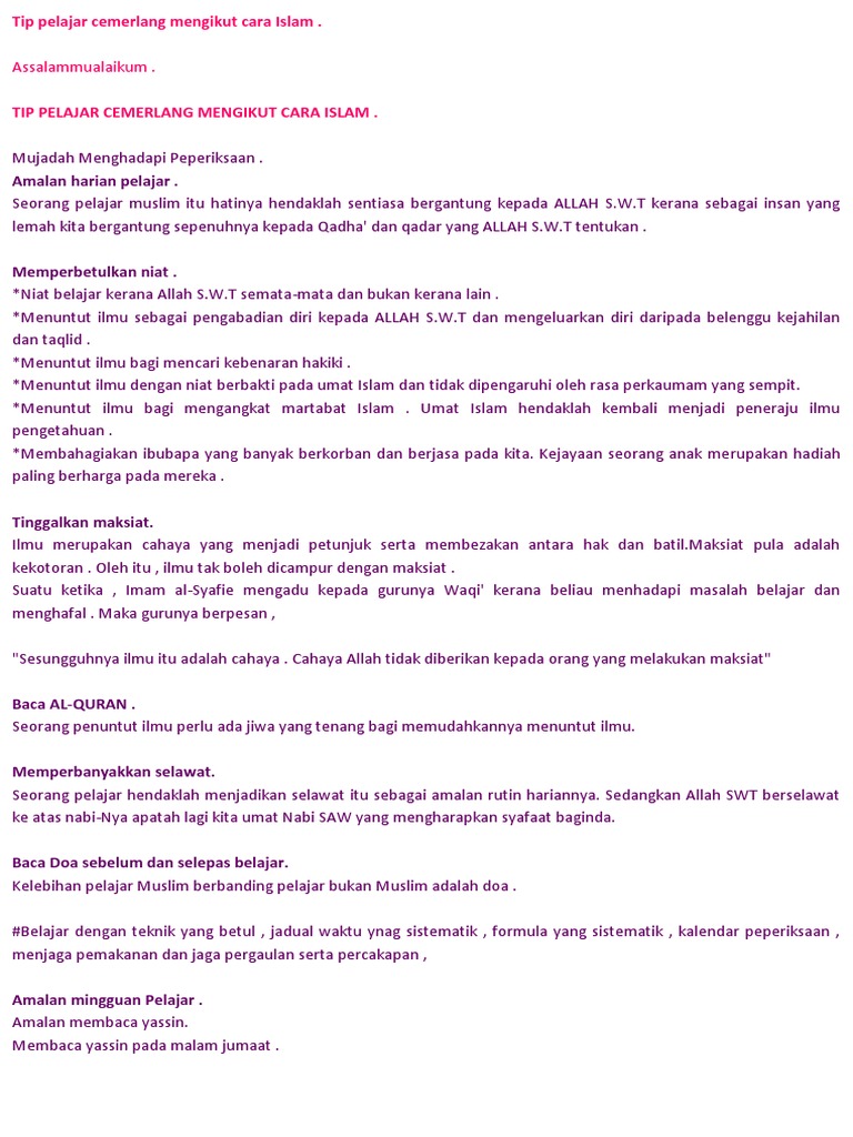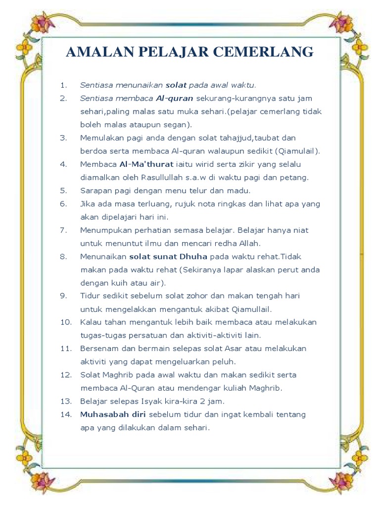 Segala amalan dimulakan dengan adab yang mulia. Pelajar perempuan dari sekolah menengah kebangsaan (smk) tun abdul razak, padawan ini mendedahkan tidur sebentar di siang hari membolehkan beliau memberi tumpuan yang lebih semasa membuat ulang kaji pada malam hari kerana mendapat rehat yang cukup. Kongsi tips pemakanan dan amalan pelajar cemerlang surah amalan untuk pelajar cemerlang Akademik yang cemerlang tetapi bagaimana pelajar yang tersendiri yang membolehkan pelajar memperolehi pencapaian akademik yang cemerlang. Semua pelajar inginkan keputusan yang.